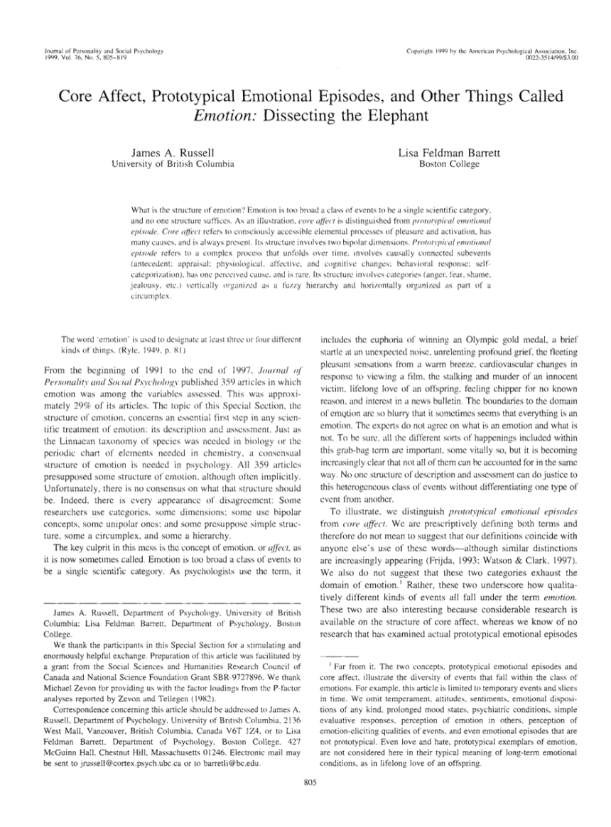 Afecto central, episodios emocionales prototípicos y otras cosas llamadas emoción: Diseccionando el elefante El trabajo de James A. Russell y Lisa F. Barrett explora la compleja naturaleza de las emociones. Los autores proponen que las emociones se componen de afectos centrales (sensaciones básicas de placer/displacer y excitación) y episodios emocionales prototípicos (emociones plenas como la ira o la alegría). Argumentan que comprender las emociones requiere analizar estos componentes y reconocer los diversos procesos y contextos que influyen en las experiencias emocionales.